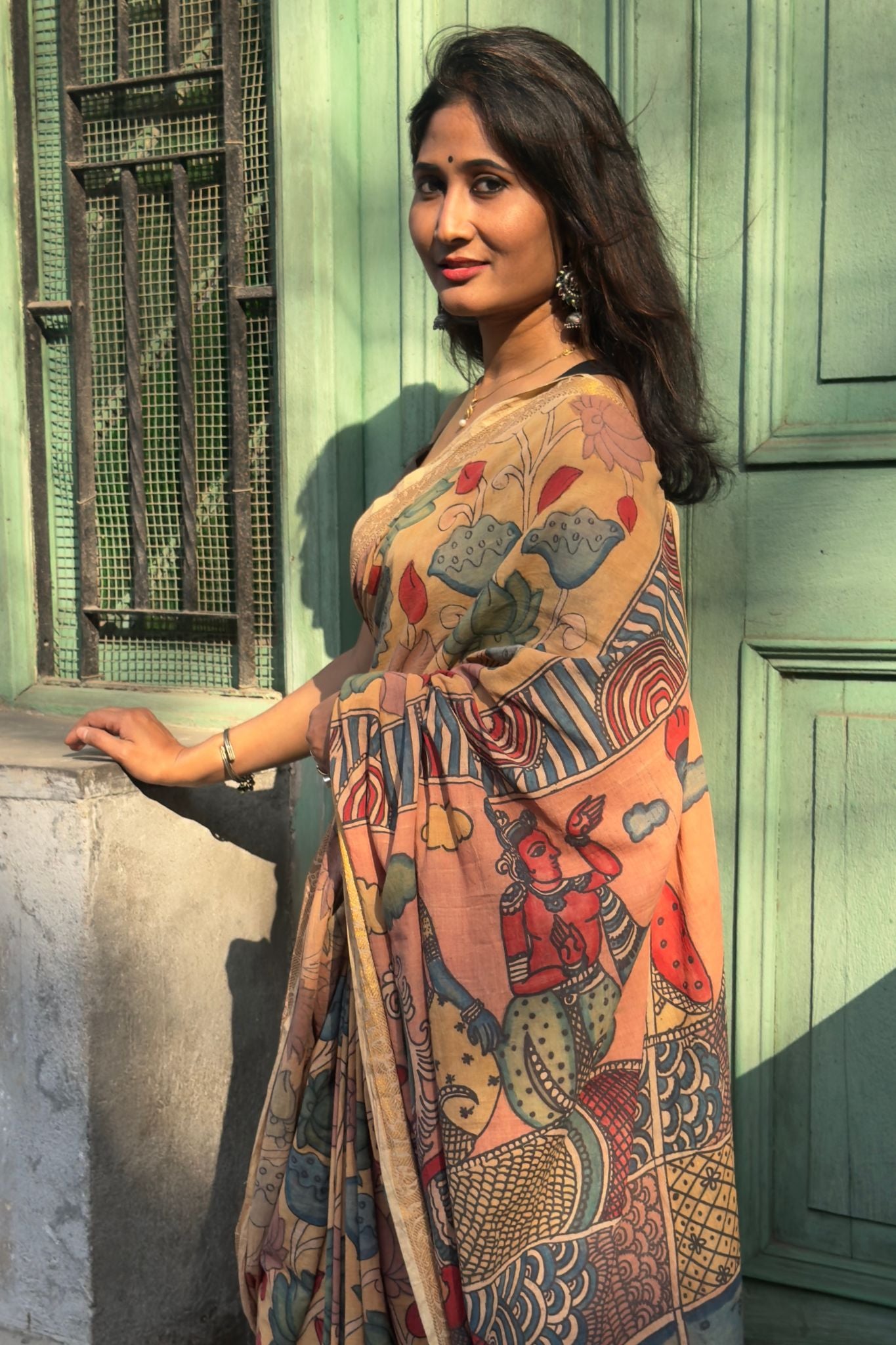 Elevate your ethnic wardrobe with this elegant hand-painted cotton Kalamkari saree in a soft beige tone, beautifully adorned with subtle coloured floral motifs across the body. A graceful blend of traditional artistry and everyday comfort, this saree reflects timeless Indian craftsmanship with understated sophistication.