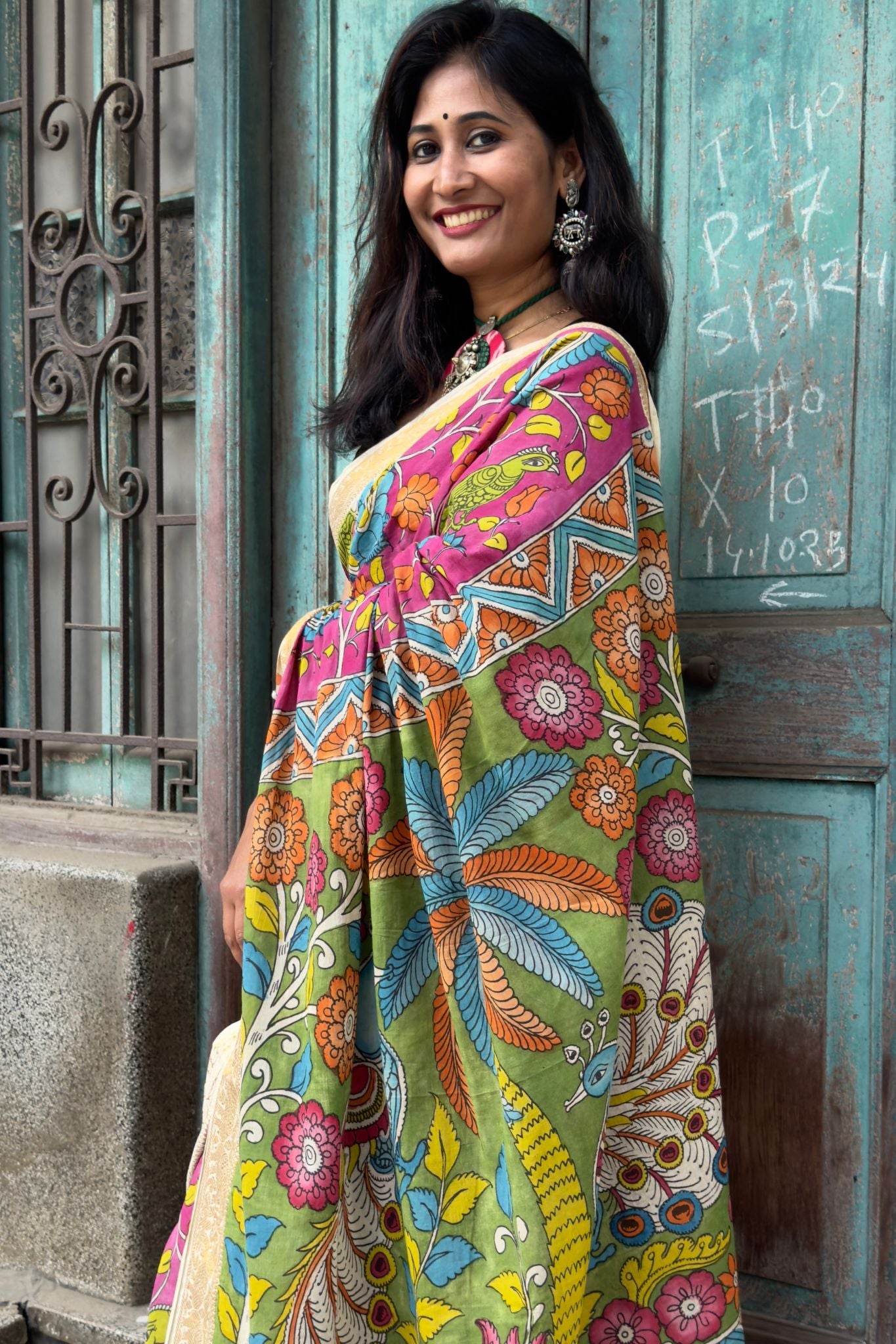 This saree celebrates traditional Kalamkari artistry while offering comfort, elegance, and timeless ethnic appeal. Pair it with handcrafted jewellery or subtle accessories for a polished traditional look.