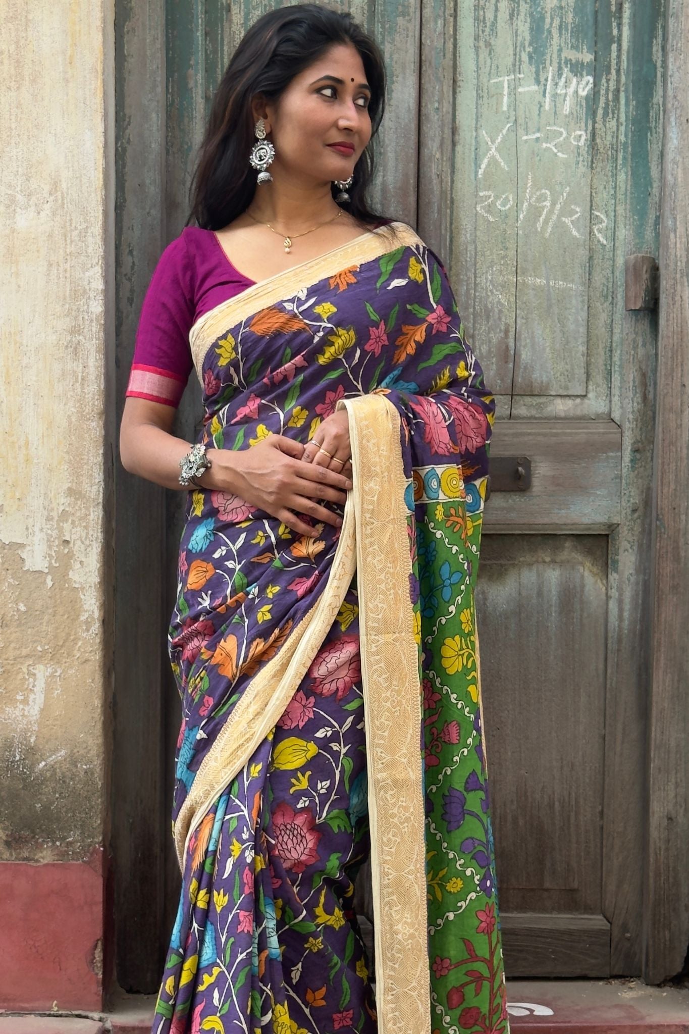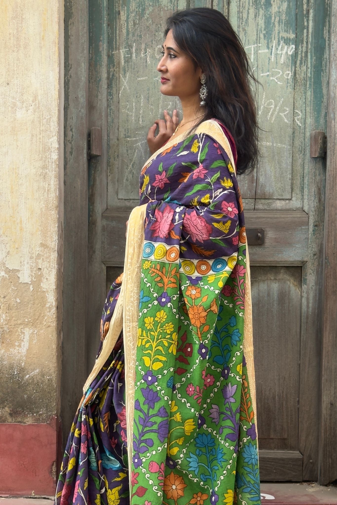 Elevate your ethnic wardrobe with this elegant hand-painted cotton Kalamkari saree, featuring a rich purple body adorned with vibrant multicolour artistic motifs. Rooted in traditional Indian craftsmanship, this saree blends breathable comfort with timeless heritage artistry.