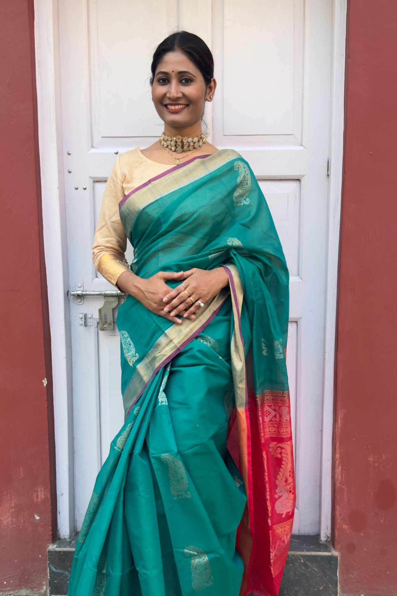š Design Highlight: A contrasting red woven pallu enhances the green base, adding vibrancy and a classic festive touch.