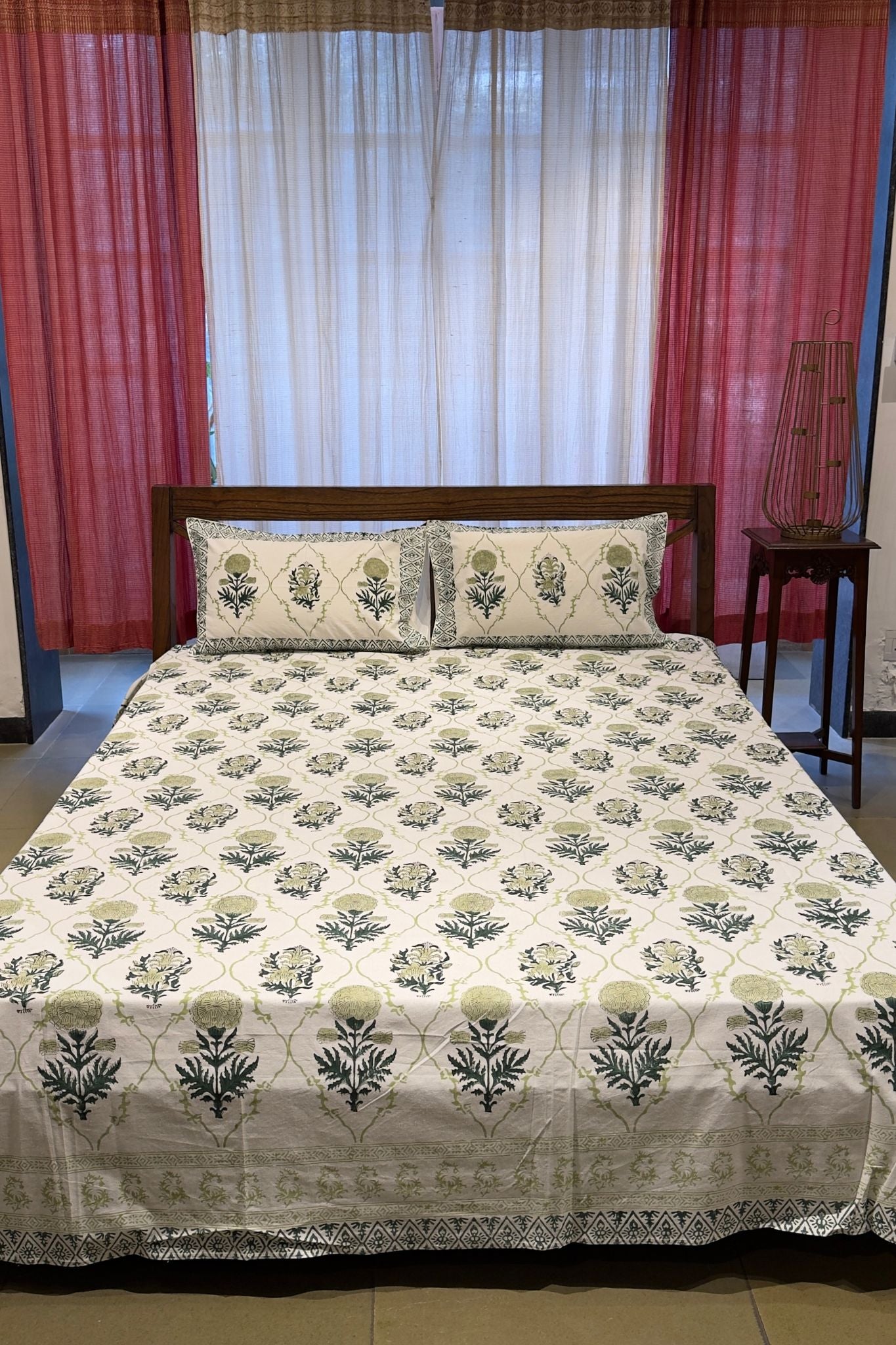 Fresh, calm, and rooted in craftsmanship, this white cotton bedsheet is adorned with delicate floral handblock prints in soothing shades of blue and green. Printed by skilled artisans using hand-carved wooden blocks, the motifs bring rhythm and softness to the fabric, celebrating the beauty of traditional handblock printing.
