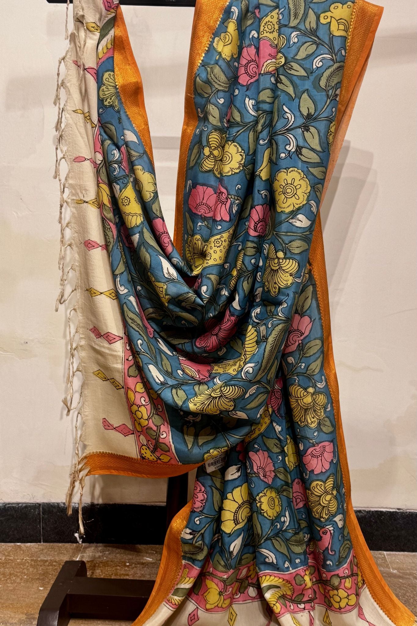 Rich in colour and storytelling, this blue silk Kalamkari dupatta is a canvas of traditional hand-painted artistry. Crafted on lustrous silk, the surface is adorned with intricate Kalamkari motifs created using age-old resist-dye and hand-painting techniques.