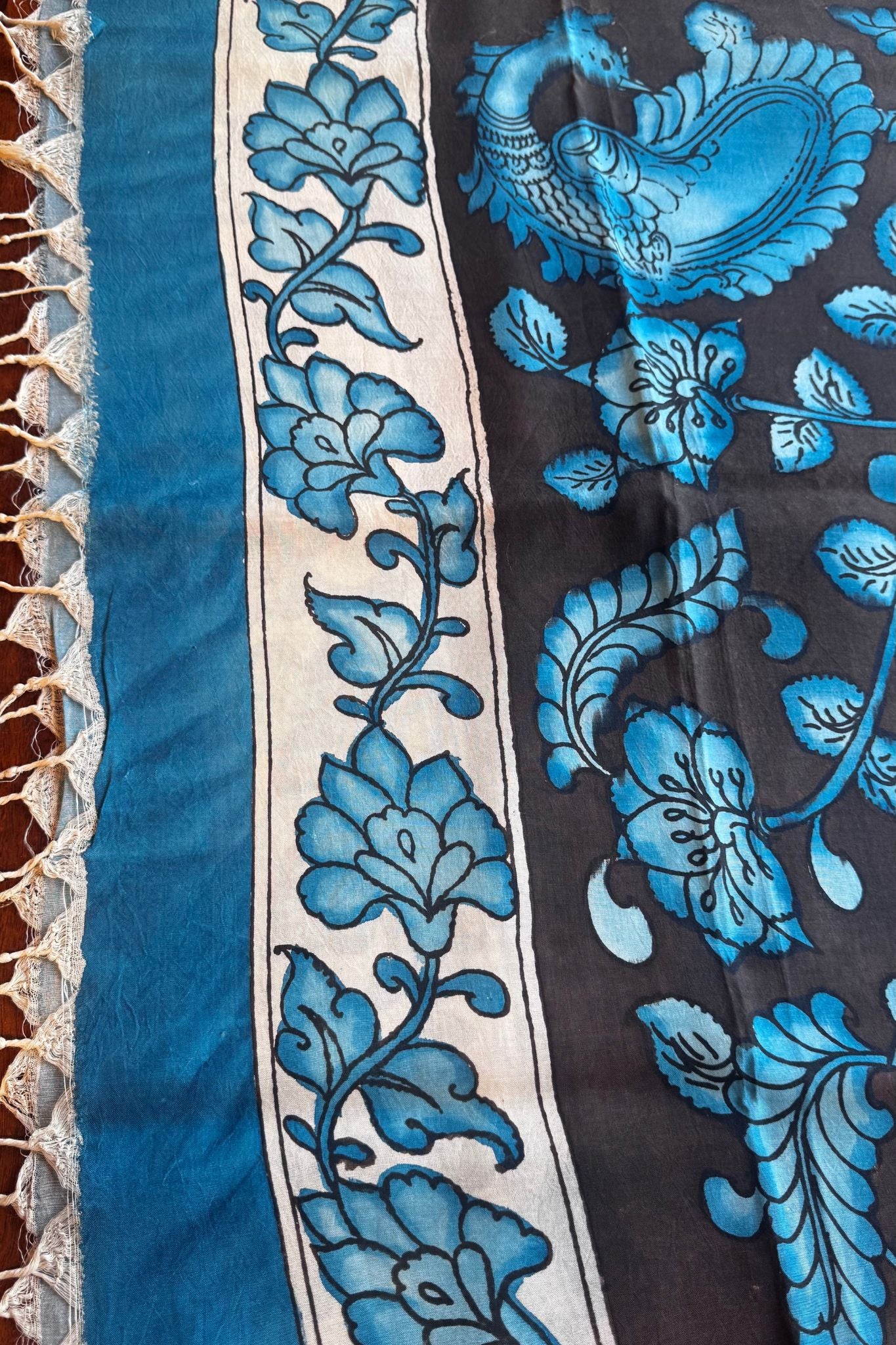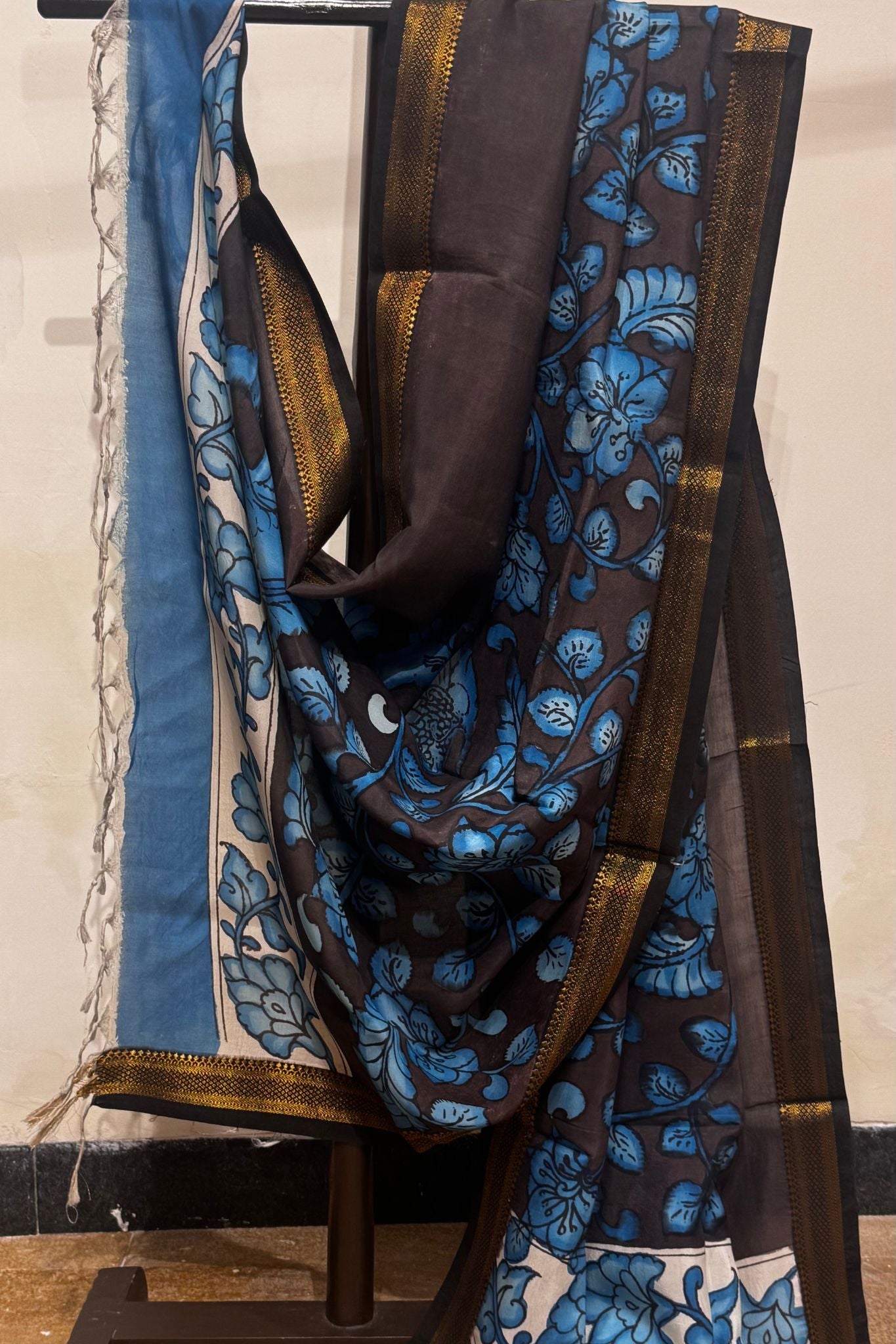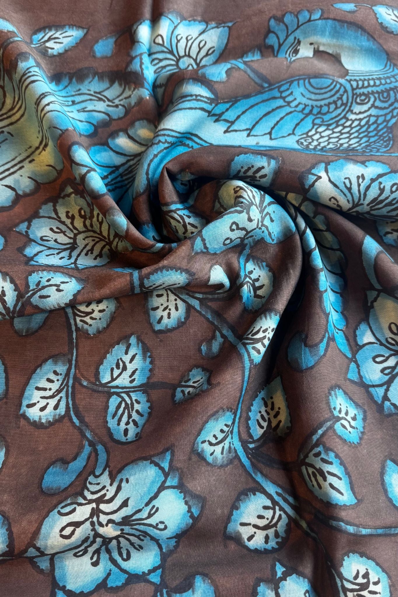 Handwoven Silk Dupatta – Brown Base with Blue Floral Motifs