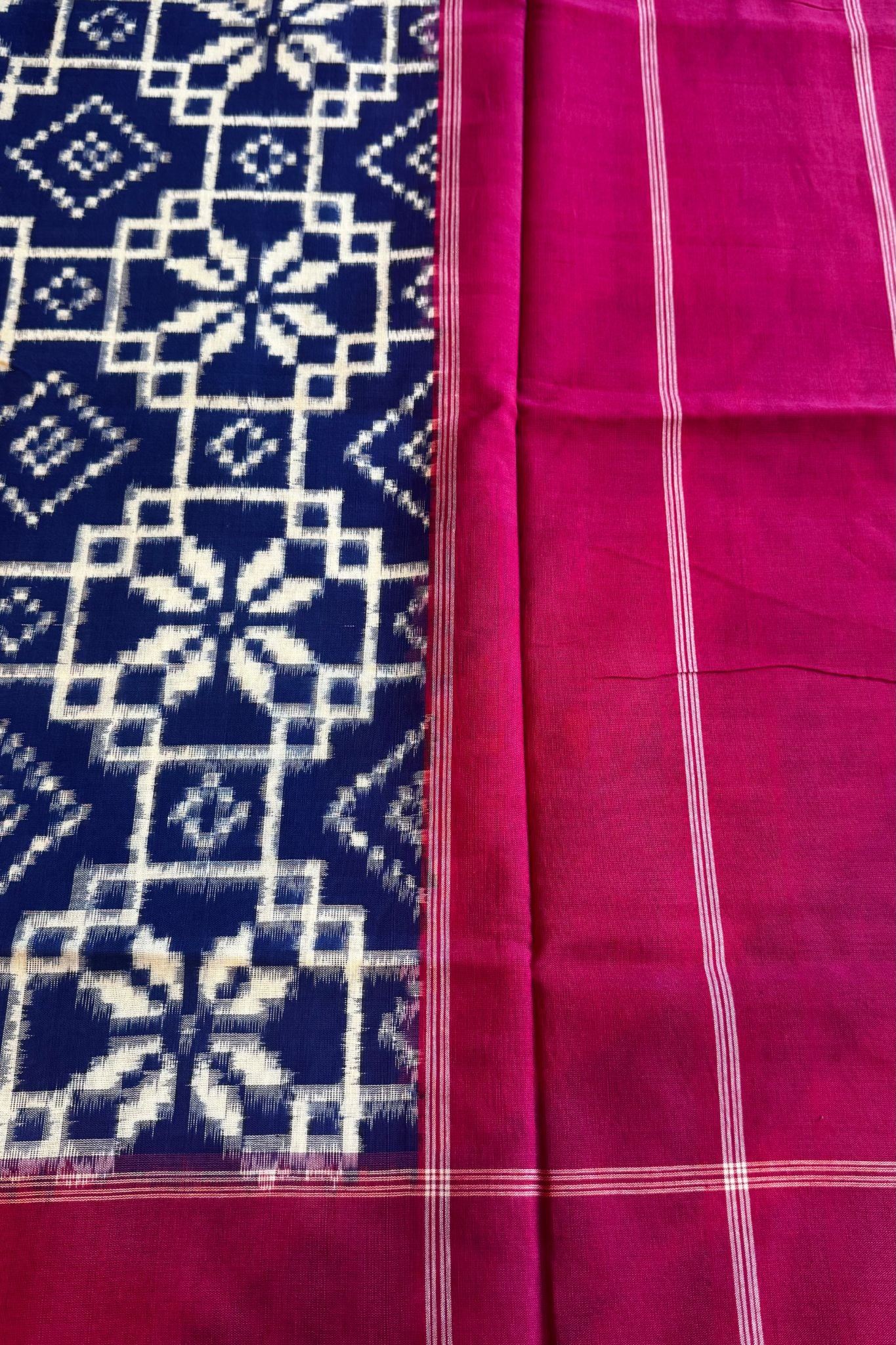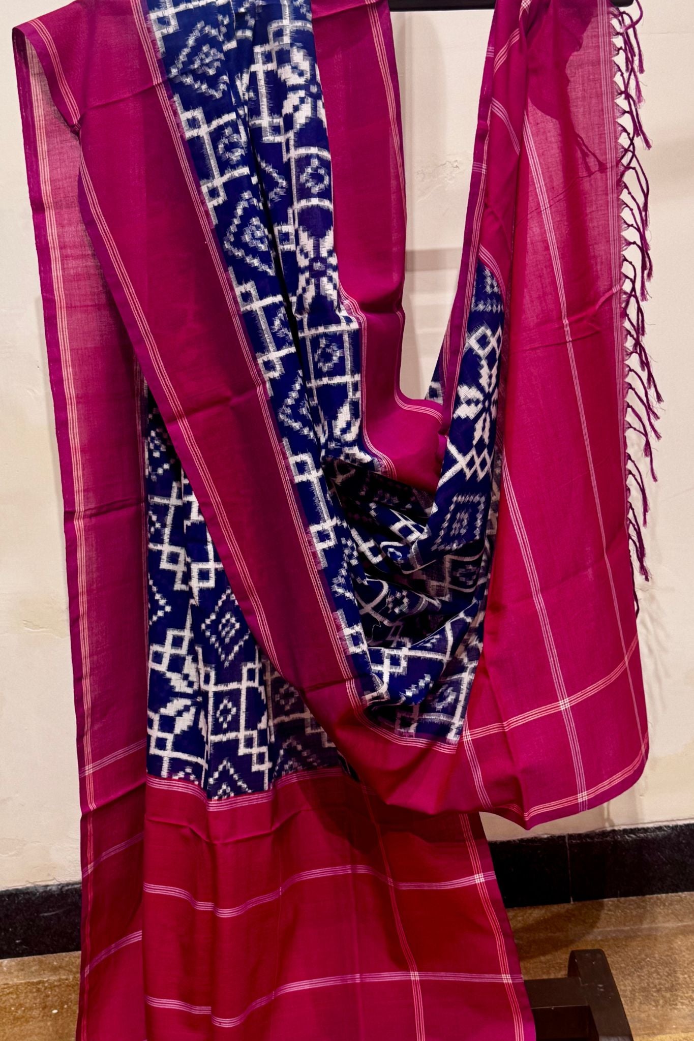 Rooted in heritage and precision, this Ikkat Telia dupatta is a striking expression of traditional resist-dye weaving. The deep blue body features classic geometric Ikkat motifs, framed with a bold red border that adds a rich, graphic contrast.