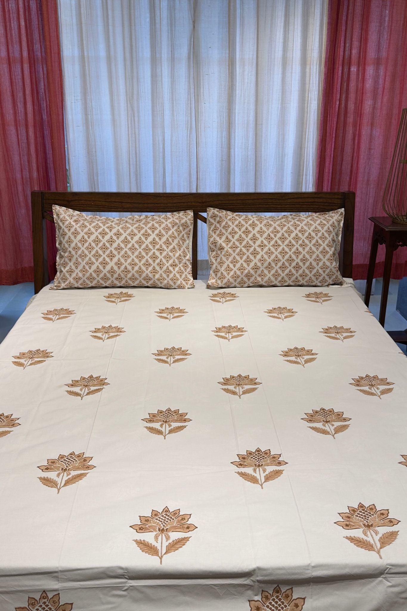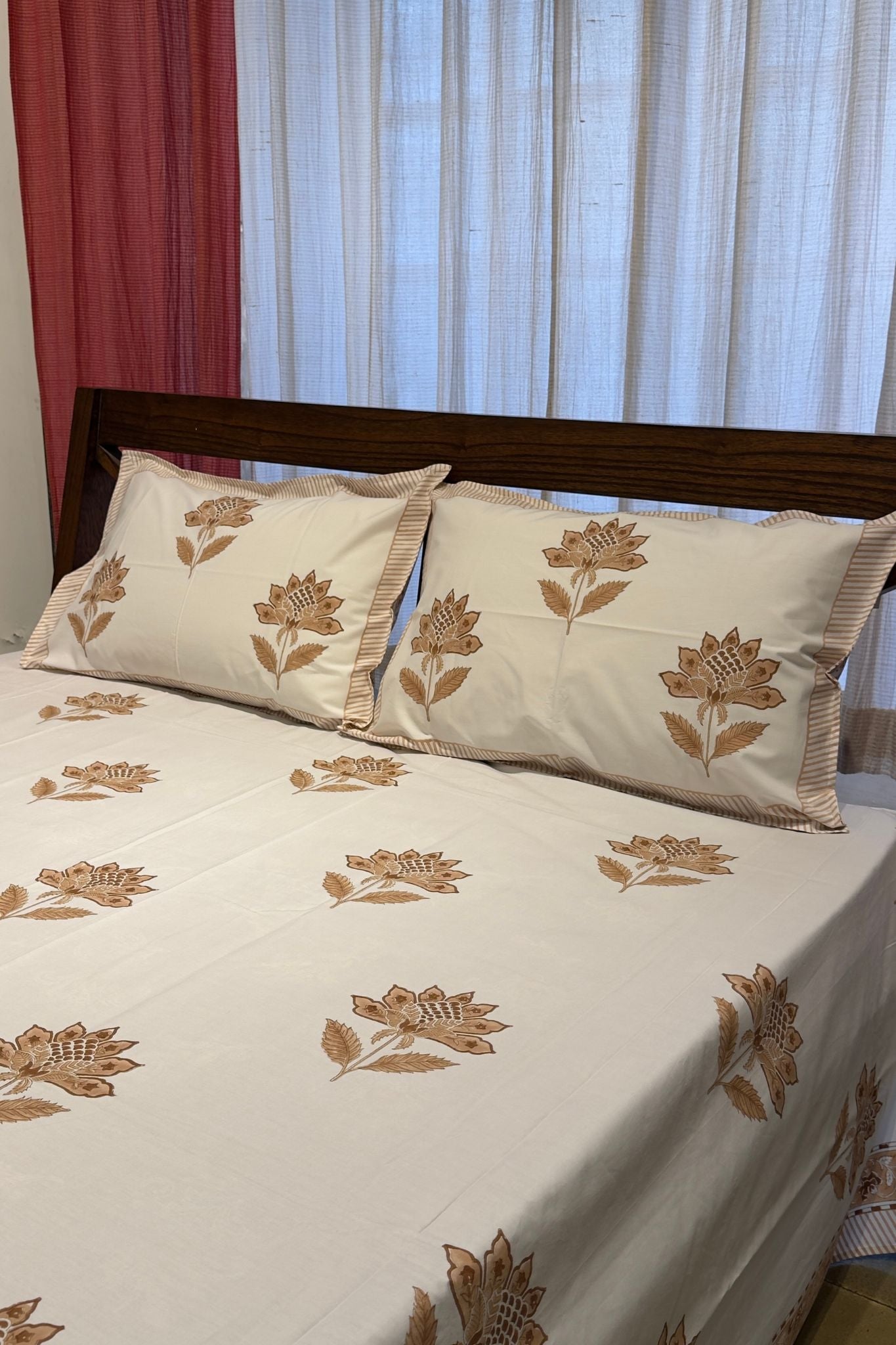 White & Brown Floral Handblock Print Bedsheet with Reversible Pillow Covers