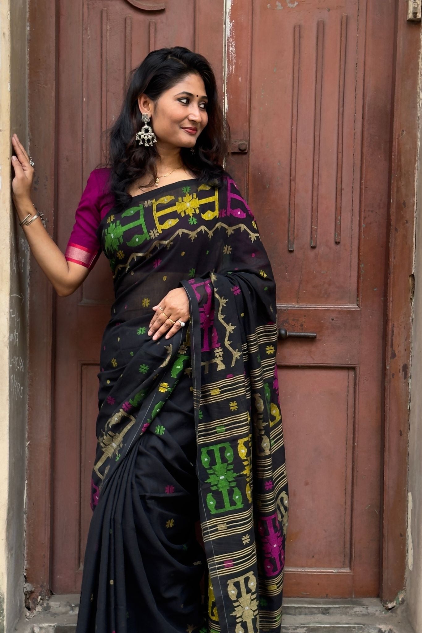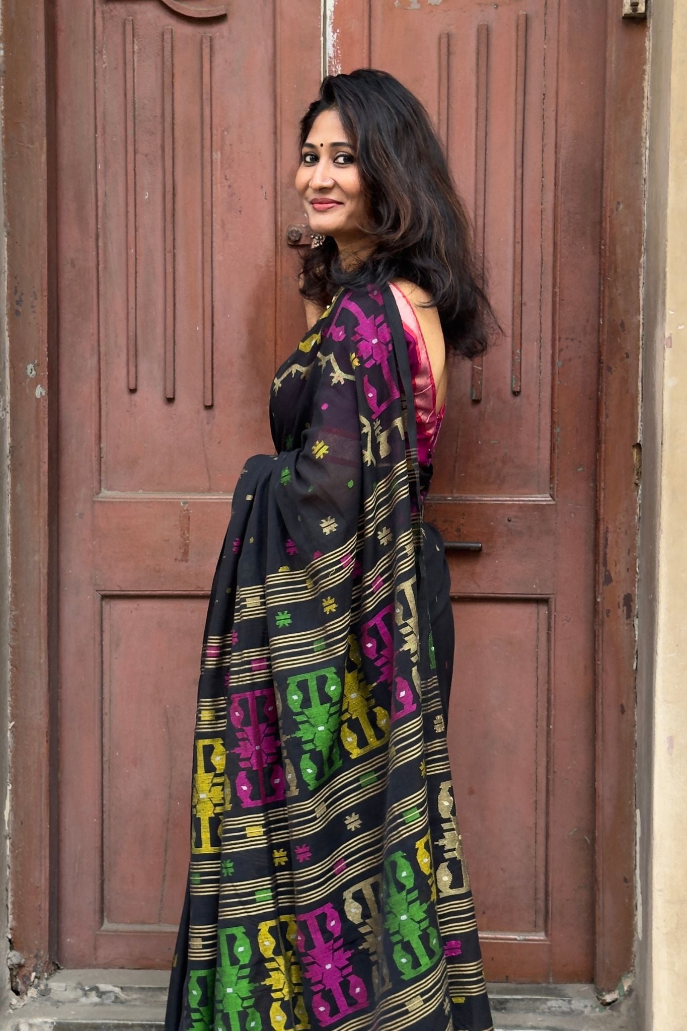 Elevate your ethnic wardrobe with this elegant Black Handloom Cotton Jamdani Saree, a timeless blend of traditional weaving artistry and contemporary sophistication. Designed for comfort and refined style, this saree beautifully reflects Indiaโs rich handloom heritage.
