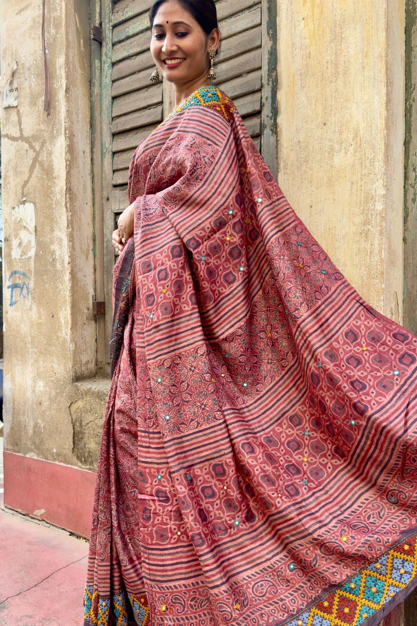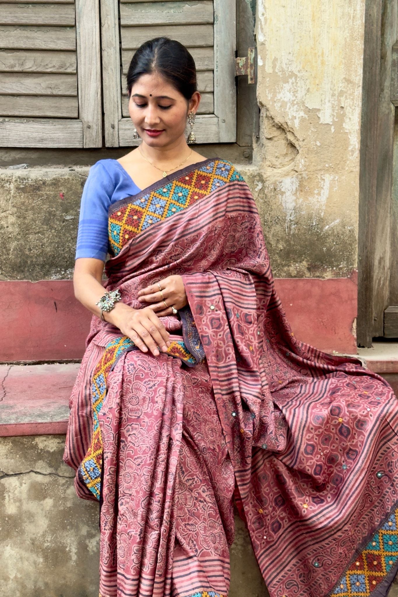 โจ Colour Palette: Deep maroon with a brown tinge creates a sophisticated, timeless ethnic aesthetic suitable for special occasions.