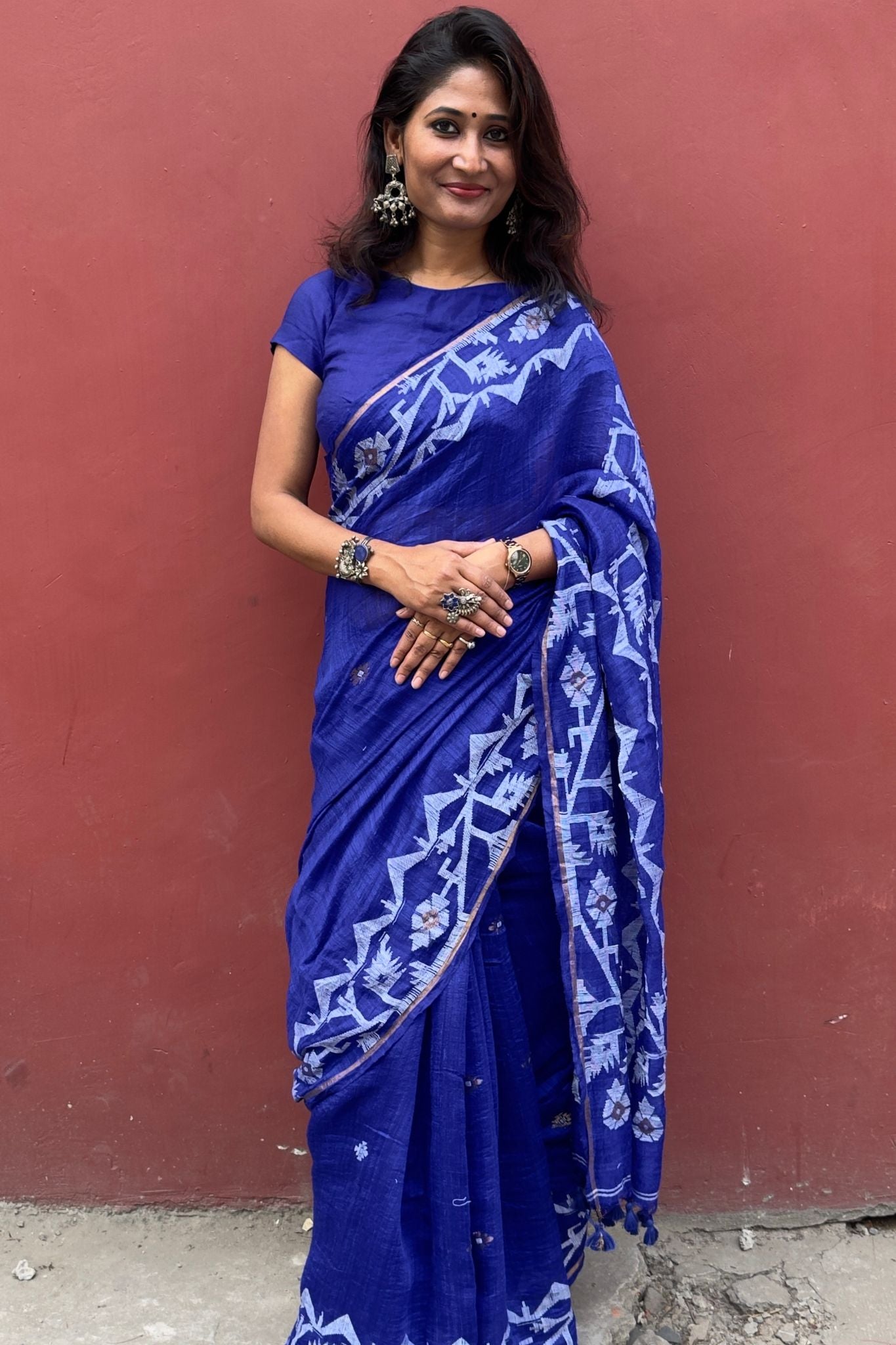 Elevate your ethnic wardrobe with this stunning royal blue Matka silk Jamdani saree, a beautiful fusion of traditional handloom artistry and rich silk texture. Known for its slightly textured weave and natural elegance, Matka silk adds depth and character to this timeless saree.